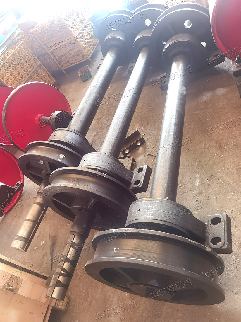 卸料車行走輪通常由車輪、軸、軸承座、密封件等共同組成。卸料車行走機構是由4個車輪及兩根通軸組成的兩個車輪對。卸料車行走輪為鑄鋼件,表面淬火處理。車輪內側或兩側的輪緣與鋼軌之間有一定的間隙,能保證車輪與軌道之間不出現啃軌現象。